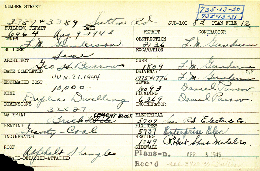 3387 Sutton Road Shaker Heights, OH 44120 PARCEL ID: 735-13-030 Building Permit Date: 08-09-1943 Plan File Number: 12, 4556 Microfilm Roll: Roll#63 Neighborhood: Moreland Owner: Gunderson, L. M. Builder: Gunderson, L. M. Architect: Burrows, George H. Estimated Cost: 10000 Date Completed: 06-21-1944 Kind: Duplex or Two-Family Material: Brick and Cement Block Heating: Gravity System Roof: Asphalt Shingles |