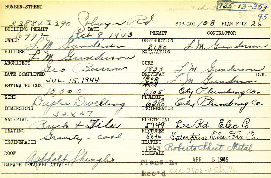 3388 Colwyn Road Shaker Heights, OH 44120 PARCEL ID: 735-13-035 Building Permit Date: 10-08-1943 Neighborhood: Moreland Owner: Gunderson, L. M. Builder: Gunderson, L. M. Architect: Burrows, George H. Estimated Cost: 10000 Date Completed: 07-15-1944 Kind: Duplex or Two-Family Material: Brick and Tile Heating: Gravity System Roof: Asphalt Shingles Blueprints: no blueprints on microfilm |