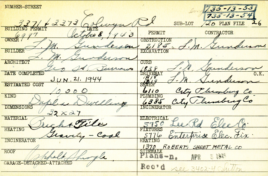 3373 Colwyn Road Shaker Heights, OH 44120 PARCEL ID: 735-13-054 Building Permit Date: 10-08-1943 Plan File Number: 1012 all scanned Microfilm Roll: Roll012 Neighborhood: Moreland Owner: Gundersen, L.M. Builder: Gundersen, L.M. Architect: Burrows, George H. Estimated Cost: 10000 Date Completed: 06-21-1944 Kind: Duplex or Two-Family Material: Brick and Tile Heating: Gravity System Roof: Asphalt Shingles |