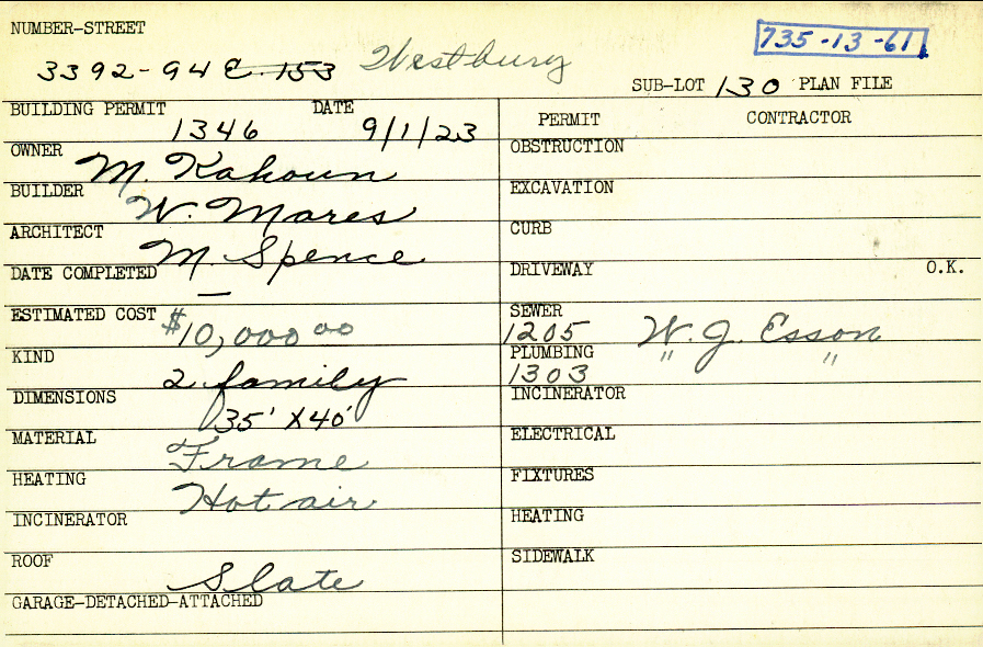 3392 Westbury Road Shaker Heights, OH 44120 PARCEL ID: 735-13-061 Building Permit Date: 09-01-1923 Plan File Number: 0 Neighborhood: Moreland Owner: Kahoun, M. Builder: Mares, W. Architect: Spence, M. Estimated Cost: 10000 Kind: Duplex or Two-Family Material: Frame Heating: Hot Air Roof: Slate |