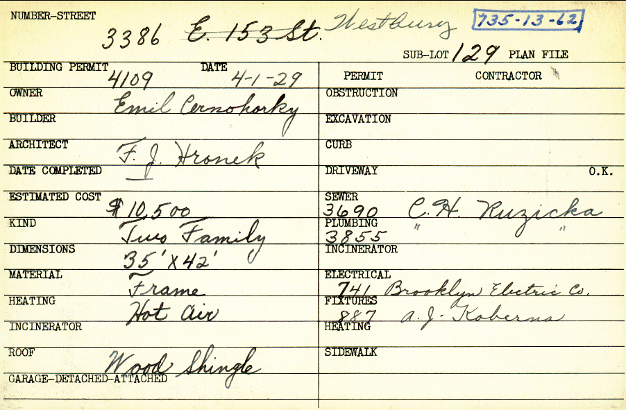 3386 Westbury Road Shaker Heights, OH 44120 PARCEL ID: 735-13-062 Building Permit Date: 04-01-1929 Plan File Number: 6842 Microfilm Roll: Roll#88 Neighborhood: Moreland Owner: Cernohorky, Emil Architect: Hronek, F. J. Estimated Cost: 10500 Kind: Duplex or Two-Family Material: Frame Heating: Hot Air Roof: Wood Shingle |