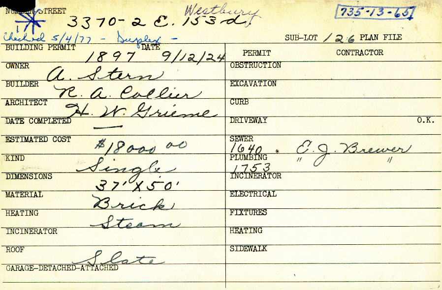 3372 Westbury Road Shaker Heights, OH 44120 PARCEL ID: 735-13-065 Building Permit Date: 09-12-1924 Plan File Number: 0 Neighborhood: Moreland Owner: Stern, A. Builder: Collier, R. A. Architect: Grieme, H. W. Estimated Cost: 18000 Kind: Duplex or Two-Family Material: Brick Heating: Steam Roof: Slate |