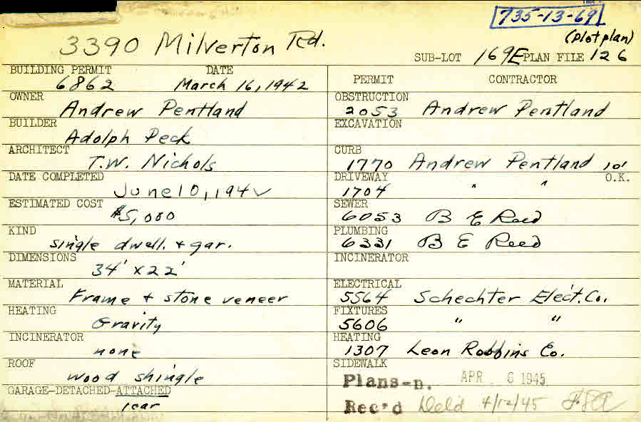 3390 Milverton Road Shaker Heights, OH 44120 PARCEL ID: 735-13-069 Building Permit Date: 03-16-1942 Plan File Number: 14 scanned, 126, 9872 Microfilm Roll: Roll001, Roll#105 Neighborhood: Moreland Owner: Pentland, Andrew Builder: Peck, Adolph Architect: Nichols, T. W. Estimated Cost: 5000 Date Completed: 06-10-1942 Kind: Single Dwelling and Garage Material: Frame and Stone Veneer Heating: Gravity System Roof: Wood Shingle Garage: attached |