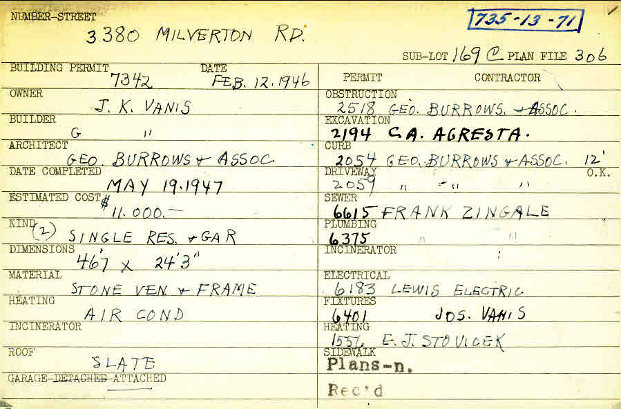 3380 Milverton Road Shaker Heights, OH 44120 PARCEL ID: 735-13-071 Building Permit Date: 02-12-1946 Plan File Number: 306 all scanned Microfilm Roll: Roll004 Neighborhood: Moreland Owner: Vanis, J. K. Builder: Vanis, J. K. Architect: George Burrows and Associates Estimated Cost: 11000 Date Completed: 05-19-1947 Kind: Single Dwelling and Garage (2) Material: Stone Veneer and Frame Heating: Air Conditioned Roof: Slate Garage: attached |