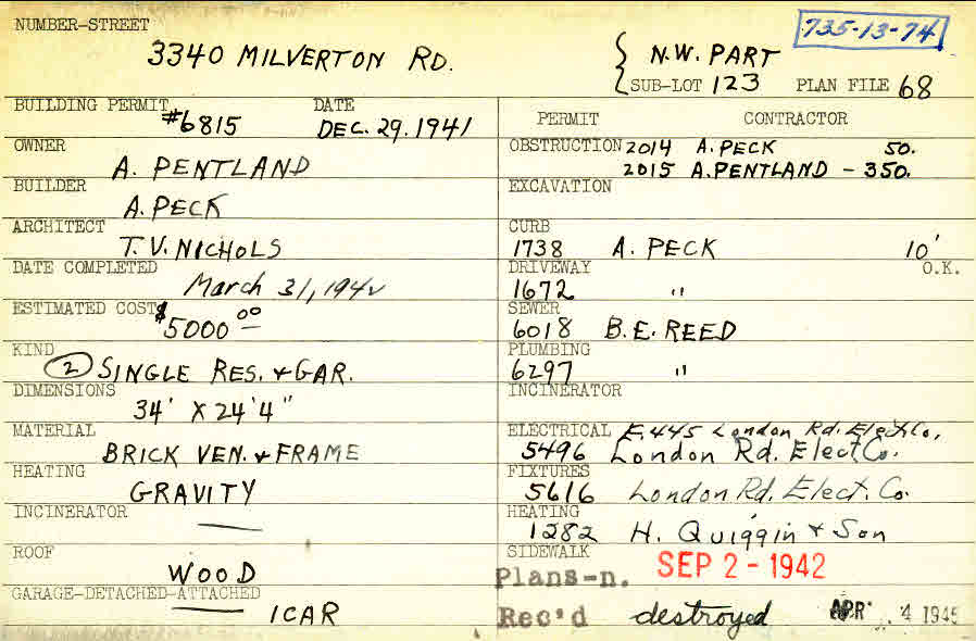 3340 Milverton Road Shaker Heights, OH 44120 PARCEL ID: 735-13-074 Building Permit Date: 12-29-1941 Plan File Number: 68 Neighborhood: Moreland Owner: Pentland, A. Builder: Peck, A. Architect: Nichols, T. V. Estimated Cost: 5000 Date Completed: 03-31-1942 Kind: Single Dwelling and Garage (2) Material: Brick Veneer and Frame Heating: Gravity System Roof: Wood Garage: attached |