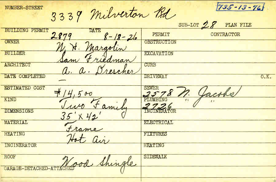 3339 Milverton Road Shaker Heights, OH 44120 PARCEL ID: 735-13-076 Building Permit Date: 08-18-1926 Plan File Number: 10400 Microfilm Roll: NewRoll#4 Neighborhood: Moreland Owner: Margolin, W. H. Builder: Friedman, Sam Architect: Drescher, A. A. Estimated Cost: 14500 Kind: Duplex or Two-Family Material: Frame Heating: Hot Air Roof: Wood Shingle |