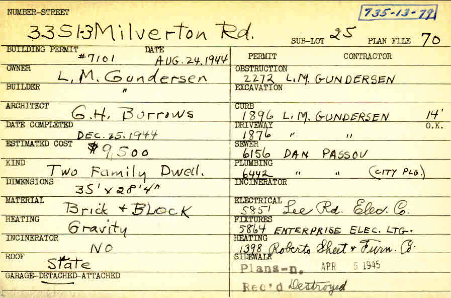 3351 Milverton Road Shaker Heights, OH 44120 PARCEL ID: 735-13-079 Building Permit Date: 08-24-1944 Plan File Number: 70 Neighborhood: Moreland Owner: Gundersen, L. M. Builder: Gundersen, L. M. Architect: Burrows, G. H. Estimated Cost: 9500 Date Completed: 12-25-1944 Kind: Duplex or Two-Family Material: Brick and Block Heating: Gravity System Roof: Slate Garage: detached |