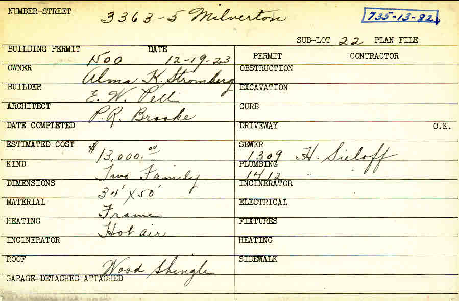 3363 Milverton Road Shaker Heights, OH 44120 PARCEL ID: 735-13-082 Building Permit Date: 12-19-1923 Plan File Number: 0 Neighborhood: Moreland Owner: Stromberg, Alma K. Builder: Pell, E. W. Architect: Brooke, Philo R. Estimated Cost: 13000 Kind: Duplex or Two-Family Material: Frame Heating: Hot Air Roof: Wood Shingle |