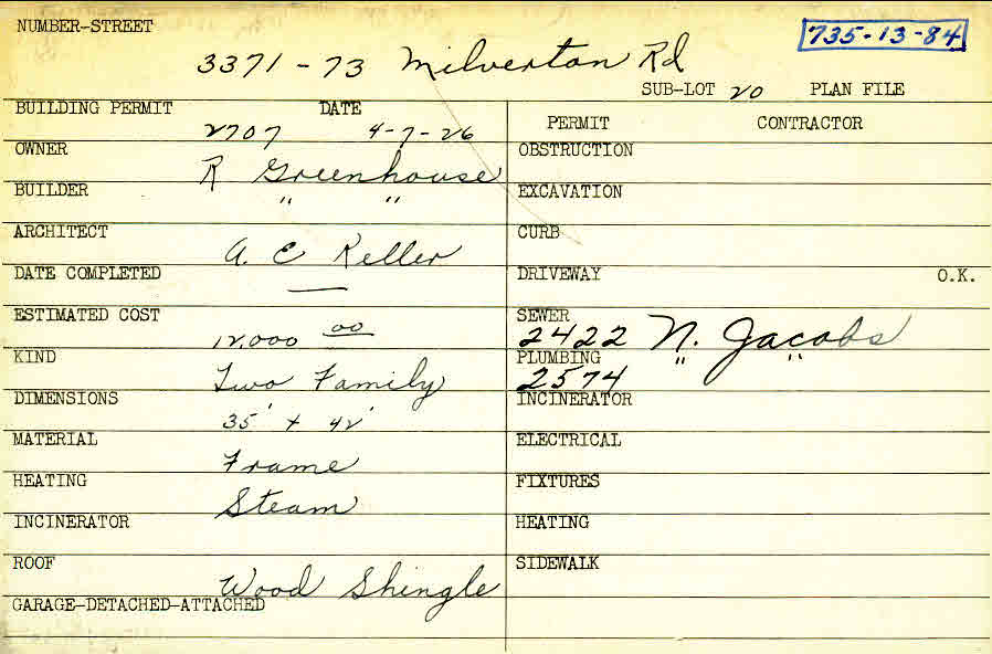 3371 Milverton Road Shaker Heights, OH 44120 PARCEL ID: 735-13-084 Building Permit Date: 04-07-1926 Plan File Number: 5251 Microfilm Roll: Roll#72 Neighborhood: Moreland Owner: Greenhouse, R. Builder: Greenhouse, R. Architect: Keller, Arthur Emil Estimated Cost: 12000 Kind: Duplex or Two-Family Material: Frame Heating: Steam Roof: Wood Shingle |