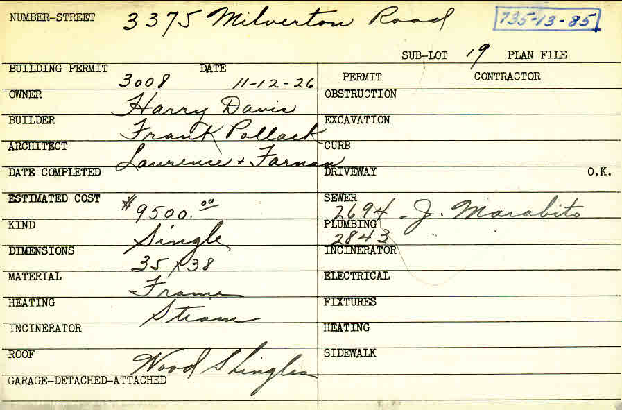 3375 Milverton Road Shaker Heights, OH 44120 PARCEL ID: 735-13-085 Building Permit Date: 11-12-1926 Plan File Number: 0 Neighborhood: Moreland Owner: Davis, Harry Builder: Pollack, Frank Architect: Farnam, Daniel and Lawrence, Ralph E. Estimated Cost: 9500 Kind: Single, Single Residence or Dwelling Material: Frame Heating: Steam Roof: Wood Shingle |