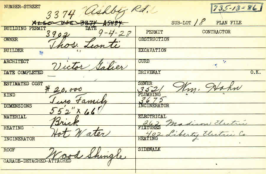 3374 Ashby Road Shaker Heights, OH 44120 PARCEL ID: 735-13-086 1930 Shaker Plat Map Vol 2 Page 2 Building Permit Date: 09-04-1928 Neighborhood: Moreland Owner: Lionti, Thomas Builder: Lionti, Thomas Architect: Galier, Victor Estimated Cost: 20000 Kind: Duplex or Two-Family Material: Brick Heating: Hot Water Roof: Wood Shingle Blueprints: no blueprints on microfilm |