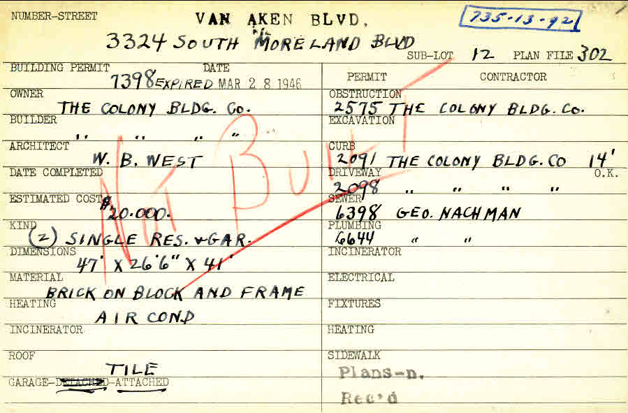 3324 Van Aken Boulevard Shaker Heights, OH 44120 PARCEL ID: 735-13-092 Building Permit Date: 03-28-1946 Plan File Number: 1115 scanned, 1644 scanned, 12882 Microfilm Roll: Roll013, Roll025, NewRoll#18 Neighborhood: Onaway Owner: The Colony Building Company Builder: The Colony Building Company Architect: West, W. B. Estimated Cost: 20000 Kind: Single Dwelling and Garage (2) Material: Brick on Block and Frame Heating: Air Conditioned Roof: Tile Garage: attached |
