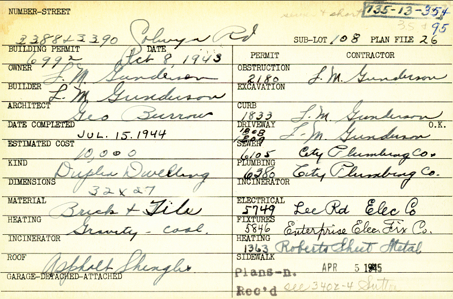 3390 Colwyn Road Shaker Heights, OH 44120 PARCEL ID: 735-13-095 Building Permit Date: 10-08-1917 Plan File Number: 26 Neighborhood: Moreland Owner: Gundersen, L.M. Builder: Gundersen, L.M. Architect: Burrow, Geo. Estimated Cost: 10000 Kind: Duplex or Two-Family Material: Brick and Tile Heating: Gravity System Roof: Asphalt Shingles |
