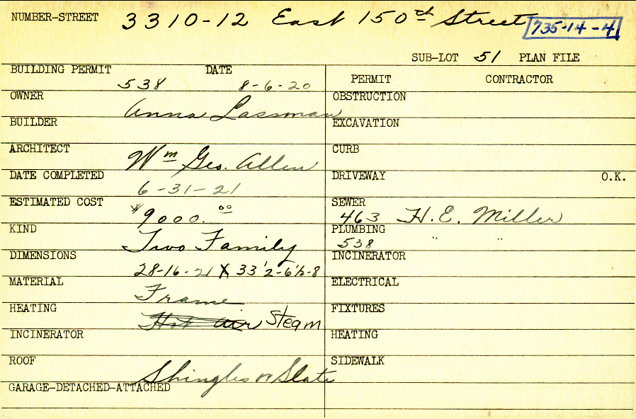 3310 Sutton Road Shaker Heights, OH 44120 PARCEL ID: 735-14-004 Building Permit Date: 08-06-1920 Plan File Number: 10363, 12134 Microfilm Roll: NewRoll#3, NewRoll#11 Neighborhood: Moreland Owner: Lassman, Anna Architect: Allen, William George Estimated Cost: 9000 Date Completed: 07-01-1921 Kind: Duplex or Two-Family Material: Frame Heating: Steam |