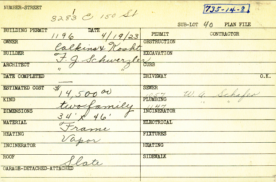 3283 Sutton Road Shaker Heights, OH 44120 PARCEL ID: 735-14-008 Building Permit Date: 04-19-1923 Plan File Number: 0 Neighborhood: Moreland Owner: Calkins and Kosht Builder: Schwerzler, F. J. Architect: Schwerzler, F. J. Estimated Cost: 14500 Kind: Duplex or Two-Family Material: Frame Heating: Vapor Roof: Slate Card Available: yes |