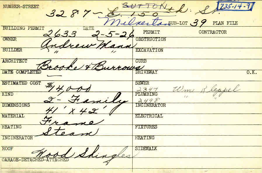 3287 Milverton Road Shaker Heights, OH 44120 PARCEL ID: 735-14-009 Building Permit Date: 02-05-1926 Plan File Number: 0 Neighborhood: Moreland Owner: Mann, Andrew Builder: Mann, Andrew Architect: Brooke and Burrows Estimated Cost: 14000 Kind: Duplex or Two-Family Material: Frame Heating: Steam Roof: Wood Shingle Card Available: yes |