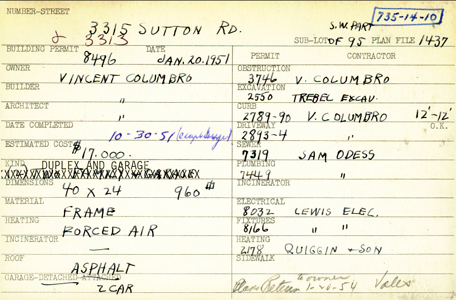 3313 Sutton Road Shaker Heights, OH 44120 PARCEL ID: 735-14-010 Building Permit Date: 01-20-1951 Plan File Number: 1437 Neighborhood: Moreland Owner: Columbro, Vincent Builder: Columbro, Vincent Architect: Columbro, Vincent Estimated Cost: 17000 Date Completed: 10-30-1951 Kind: Duplex or Two-Family and Garage Material: Frame Heating: Forced Air Roof: Asphalt Garage: detached 2 car Card Available: yes |