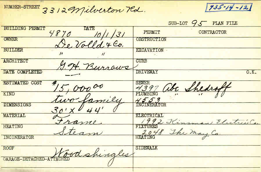 3312 Milverton Road Shaker Heights, OH 44120 PARCEL ID: 735-14-012 Building Permit Date: 10-01-1931 Plan File Number: 0 Neighborhood: Moreland Owner: DeVolld and Company Builder: DeVolld and Company Architect: Burrows, G. H. Estimated Cost: 15000 Kind: Duplex or Two-Family Material: Frame Heating: Steam Roof: Wood Shingle |