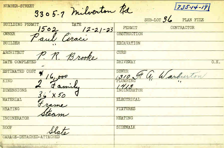 3305 Milverton Road Shaker Heights, OH 44120 PARCEL ID: 735-14-019 Building Permit Date: 12-21-1923 Plan File Number: 6125 Microfilm Roll: Roll#83 Neighborhood: Moreland Owner: Ciraci, Paul Builder: Ciraci, Paul Architect: Brooke, Philo R. Estimated Cost: 16000 Kind: Duplex or Two-Family Material: Frame Heating: Steam Roof: Slate |