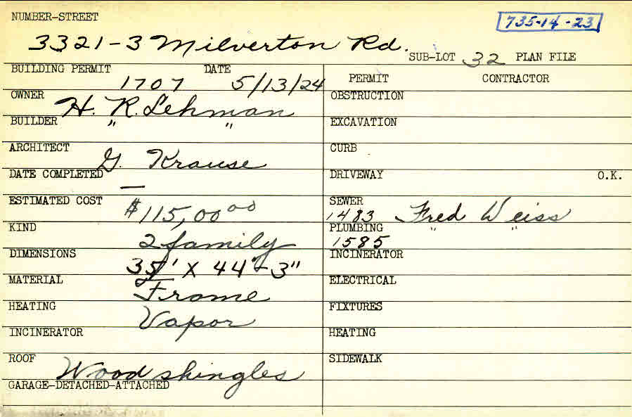 3321 Milverton Road Shaker Heights, OH 44120 PARCEL ID: 735-14-023 Building Permit Date: 05-13-1924 Plan File Number: 6526 Microfilm Roll: Roll#86 Neighborhood: Moreland Owner: Lehman, H. R. Builder: Lehman, H. R. Architect: Krause, G. Estimated Cost: 11,500 Kind: Duplex or Two-Family Material: Frame Heating: Vapor Roof: Wood Shingle |