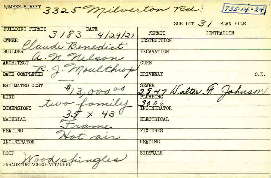 3325 Milverton Road Shaker Heights, OH 44120 PARCEL ID: 735-14-024 Building Permit Date: 04-29-1927 Plan File Number: 5894, 5925 Microfilm Roll: Roll#79, Roll#80 Neighborhood: Moreland Owner: Benedict, Claude Builder: Nelson, A N. Architect: Moulthrop, R. J. Estimated Cost: 13000 Kind: Duplex or Two-Family Material: Frame Heating: Hot Air Roof: Wood Shingle |