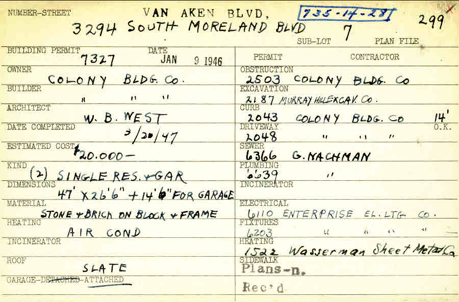 3294 Van Aken Boulevard Shaker Heights, OH 44120 PARCEL ID: 735-14-028 Building Permit Date: 01-09-1946 Plan File Number: 299 all scanned Microfilm Roll: Roll004 Neighborhood: Onaway Owner: Colony Building Company Builder: Colony Building Company Architect: West, W. B. Estimated Cost: 20000 Date Completed: 03-20-1947 Kind: Single Dwelling and Garage (2) Material: Stone and Brick on Block and Frame Heating: Air Conditioned Roof: Slate Garage: attached |