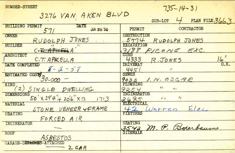 3276 Van Aken Boulevard Shaker Heights, OH 44120 PARCEL ID: 735-14-031 Building Permit Date: 06-20-1956 Plan File Number: 2710, 3663 Microfilm Roll: Roll #37, Roll#55 Neighborhood: Onaway Owner: Jones, Rudolph Builder: Jones, Rudolph Architect: Apicella, C. T. Estimated Cost: 30000 Date Completed: 08-02-1957 Kind: Single, Single Residence or Dwelling (2) Material: Stone Veneer and Frame Heating: Forced Air Roof: Asbestos Garage: attached 2 car |