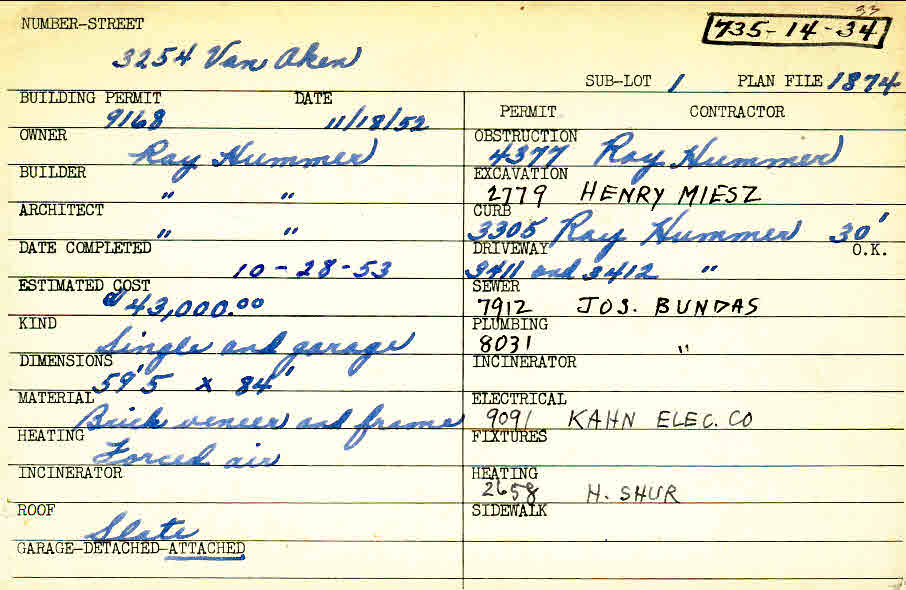 3254 Van Aken Boulevard Shaker Heights, OH 44120 PARCEL ID: 735-14-034 Building Permit Date: 11-18-1952 Plan File Number: 1874 all scanned Microfilm Roll: Roll028 Neighborhood: Onaway Owner: Hummer, Ray Builder: Hummer, Ray Architect: Hummer, Ray Estimated Cost: 43000 Date Completed: 10-28-1953 Kind: Single Dwelling and Garage Material: Brick Veneer and Frame Heating: Forced Air Roof: Slate Garage: attached |