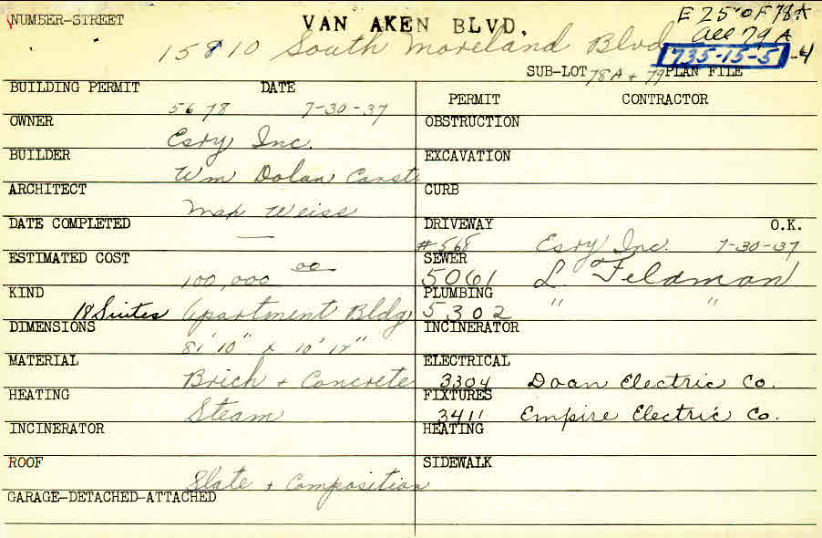 15810 Van Aken Boulevard Shaker Heights, OH 44120 PARCEL ID: 735-15-005 Building Permit Date: 07-30-1937 Plan File Number: 0 Neighborhood: Moreland Owner: Esry Inc. Builder: William Dolan Construction Architect: Weiss, Max Estimated Cost: 100000 Kind: Apartment or Multi-family (3+) Material: Brick and Concrete Heating: Steam Roof: Slate |