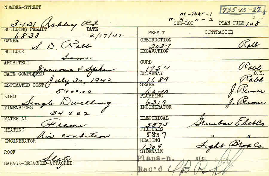 3421 Ashby Road Shaker Heights, OH 44120 PARCEL ID: 735-15-022 Building Permit Date: 02-17-1942 Plan File Number: 47 scanned, 108 Microfilm Roll: Roll001 Neighborhood: Moreland Owner: Rabb, S. D. Builder: Rabb, S. D. Architect: Jeavons and Sphan Estimated Cost: 5400 Date Completed: 07-30-1942 Kind: Single, Single Residence or Dwelling Material: Frame Heating: Air Conditioned Roof: Slate Garage: attached |