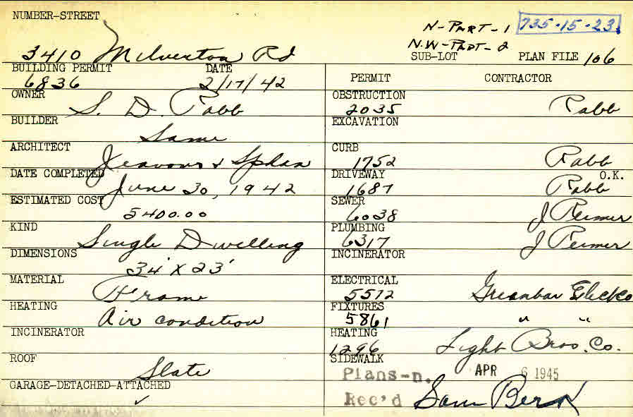 3410 Milverton Road Shaker Heights, OH 44120 PARCEL ID: 735-15-023 Building Permit Date: 02-17-1942 Neighborhood: Moreland Owner: Rabb, S. D. Builder: Rabb, S. D. Architect: Jeavons and Sphan Estimated Cost: 5400 Date Completed: 06-30-1942 Kind: Single, Single Residence or Dwelling Material: Frame Heating: Air Conditioned Roof: Slate Garage: attached Blueprints: no blueprints on microfilm |