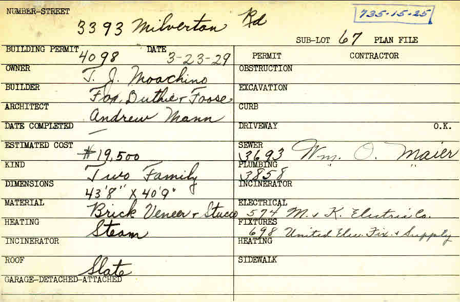 3393 Milverton Road Shaker Heights, OH 44120 PARCEL ID: 735-15-025 Building Permit Date: 03-23-1929 Plan File Number: 10472 Microfilm Roll: NewRoll#4 Neighborhood: Moreland Owner: Moachino, T. J. Builder: Fox, Duthie and Foose Architect: Mann, Andrew Estimated Cost: 19500 Kind: Duplex or Two-Family Material: Brick Veneer and Stucco Heating: Steam Roof: Slate |