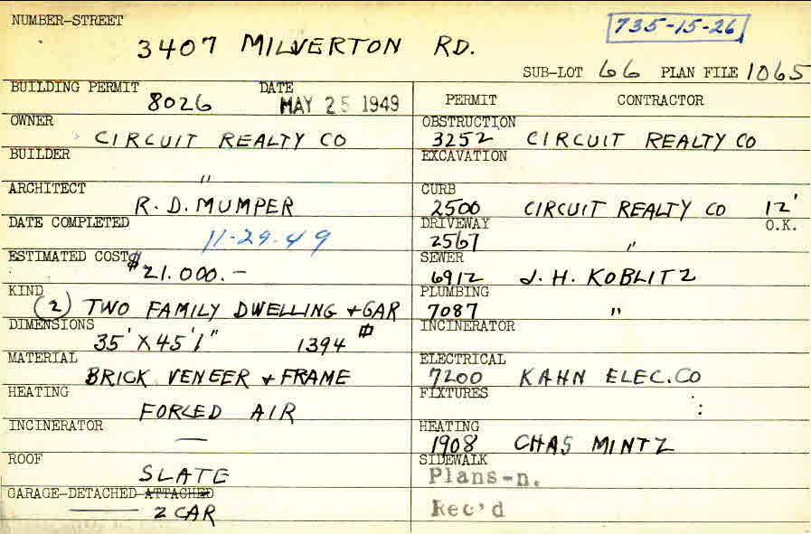 3407 Milverton Road Shaker Heights, OH 44120 PARCEL ID: 735-15-026 Building Permit Date: 05-25-1949 Plan File Number: 1065 all scanned Microfilm Roll: Roll013 Neighborhood: Moreland Owner: Circuit Realty Company Builder: Circuit Realty Company Architect: Mumper, R. D. Estimated Cost: 21000 Date Completed: 11-29-1949 Kind: Duplex or Two-Family and Garage Material: Brick Veneer and Frame Heating: Forced Air Roof: Slate Garage: detached 2 car |