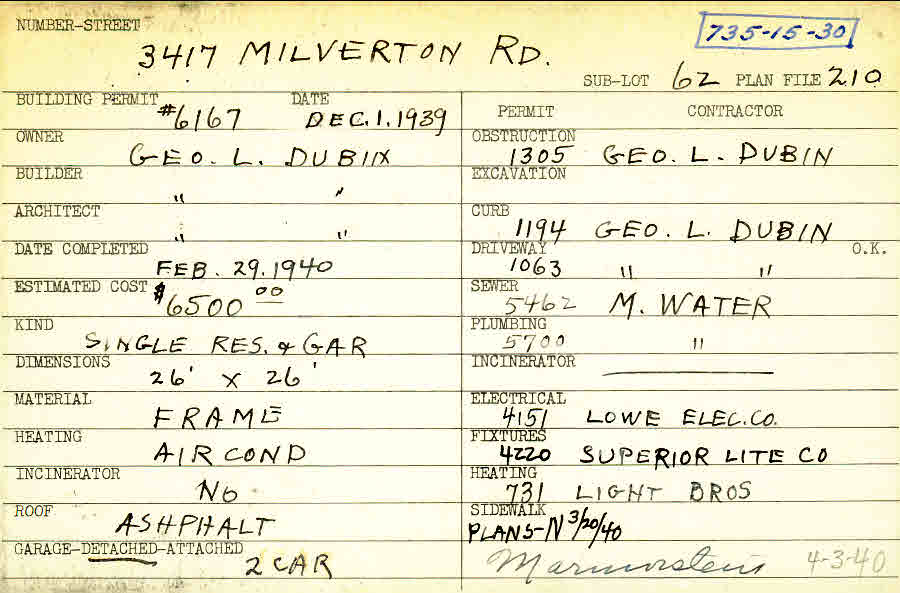 3417 Milverton Road Shaker Heights, OH 44120 PARCEL ID: 735-15-030 Building Permit Date: 12-01-1939 Plan File Number: 210, 7540, 11529 Microfilm Roll: Roll#93, NewRoll#8 Neighborhood: Moreland Owner: Dubin, George L. Builder: Dubin, George L. Architect: Dubin, George L. Estimated Cost: 6500 Date Completed: 02-29-1940 Kind: Single Dwelling and Garage Material: Frame Heating: Air Conditioned Roof: Asphalt Garage: detached 2 car |
