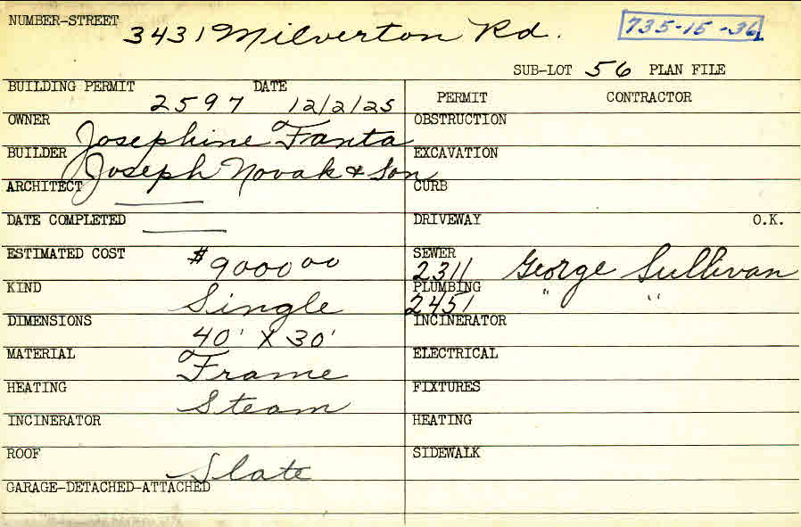 3431 Milverton Road Shaker Heights, OH 44120 PARCEL ID: 735-15-036 Building Permit Date: 12-02-1925 Plan File Number: 0 Neighborhood: Moreland Owner: Fanta, Josephine Builder: Joseph Novak and Son Estimated Cost: 9000 Kind: Single, Single Residence or Dwelling Material: Frame Heating: Steam Roof: Slate Card Available: yes |