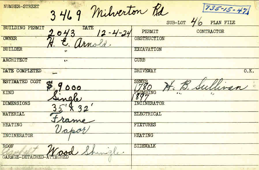 3469 Milverton Road Shaker Heights, OH 44120 PARCEL ID: 735-15-047 Building Permit Date: 12-04-1924 Plan File Number: 0 Neighborhood: Moreland Owner: Arnold, H. E. Builder: Arnold, H. E. Architect: Arnold, H. E. Estimated Cost: 9000 Kind: Single, Single Residence or Dwelling Material: Frame Heating: Vapor Roof: Wood Shingle Card Available: yes |