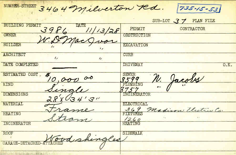 3464 Milverton Road Shaker Heights, OH 44120 PARCEL ID: 735-15-053 Building Permit Date: 11-13-1928 Plan File Number: 1646 all scanned Microfilm Roll: Roll025 Neighborhood: Moreland Owner: MacIvor, W. D. Builder: MacIvor, W. D. Architect: MacIvor, W. D. Estimated Cost: 10000 Kind: Single, Single Residence or Dwelling Material: Frame Heating: Steam Roof: Wood Shingle |