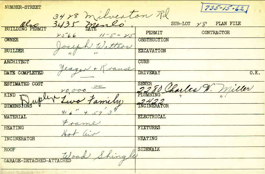 3428 Milverton Road Shaker Heights, OH 44120 PARCEL ID: 735-15-062 Building Permit Date: 11-05-1925 Plan File Number: 6901 Microfilm Roll: Roll#90 Neighborhood: Moreland Owner: Watters, Joseph Builder: Watters, Joseph Architect: Yeager and Krause Estimated Cost: 20000 Kind: Duplex or Two-Family Material: Frame Heating: Hot Air Roof: Wood Shingle |