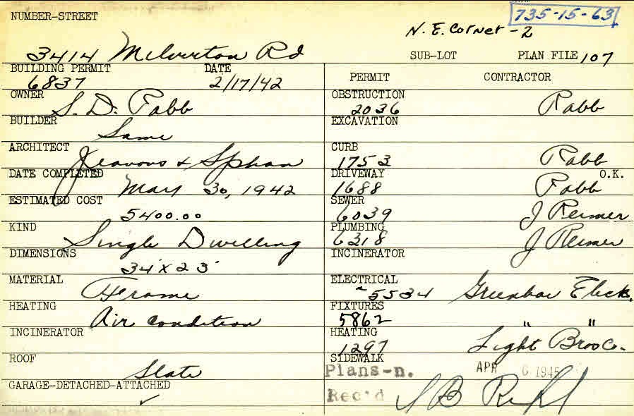 3414 Milverton Road Shaker Heights, OH 44120 PARCEL ID: 735-15-063 Building Permit Date: 02-17-1942 Neighborhood: Moreland Owner: Rabb, S. D. Builder: Rabb, S. D. Architect: Jeavons and Sphan Estimated Cost: 5400 Date Completed: 05-30-1942 Kind: Single, Single Residence or Dwelling Material: Frame Heating: Air Conditioned Roof: Slate Garage: attached Blueprints: no blueprints on microfilm |