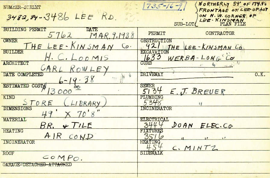 3482 Lee Road Shaker Heights, OH 44120 PARCEL ID: 735-16-009 Building Permit Date: 03-09-1938 Plan File Number: 1562 scanned, 6816, 9687, 9688, 9689, 9690 Microfilm Roll: Roll024, Roll#88, Roll#104 Owner: The Lee - Kinsman Company Builder: Loomis, H. C. Architect: Rowley, Carl Estimated Cost: 13000 Date Completed: 06-19-1938 Kind: Commercial - Retail or Office Material: Brick and Tile Heating: Air Conditioned Card Available: Yes |  |