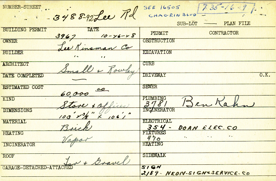 3492 Lee Road Shaker Heights, OH 44120 PARCEL ID: 735-16-009 Building Permit Date: 10-26-1928 Plan File Number: 5427, 5475 Microfilm Roll: Roll#73, Roll#74 Owner: Lee Kinsman Company Builder: Lee Kinsman Company Architect: Small and Rowley Estimated Cost: 60000 Kind: Commercial - Retail or Office Material: Brick Heating: Vapor Card Available: Yes |  |