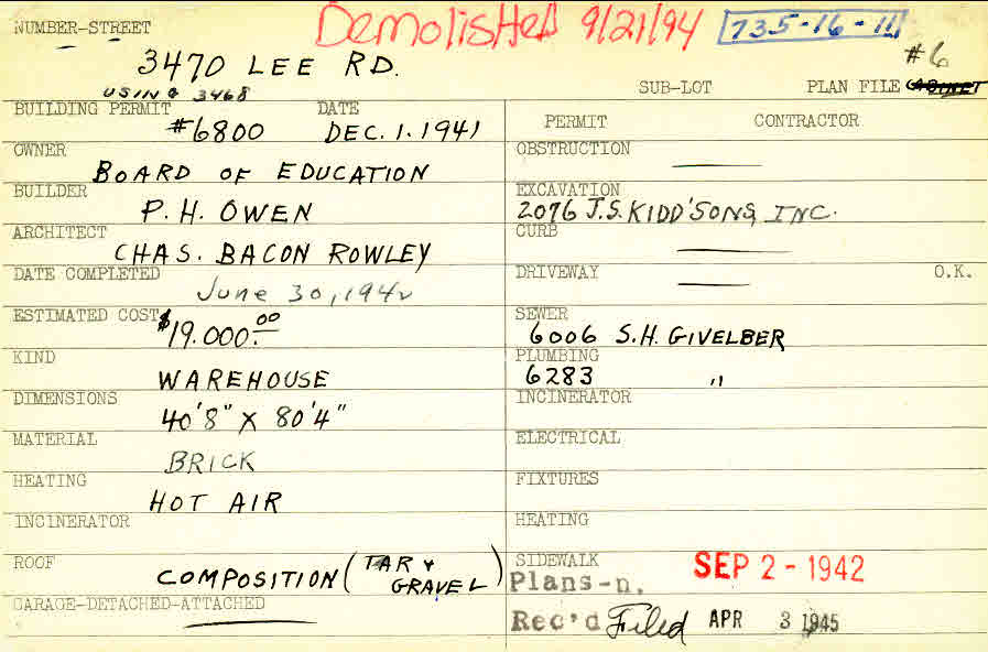 3470 Lee Road Shaker Heights, OH 44120 PARCEL ID: 735-16-011 Building Permit Date: 12-01-1941 Plan File Number: 834 scanned, 5260 Microfilm Roll: Roll011, Roll#72 Owner: Board of Education Builder: Owen, P. H. Architect: Rowley, Charles Bacon Estimated Cost: 19000 Date Completed: 06-30-1942 Kind: Government and Municipal (incl. Schools) Material: Brick Heating: Hot Air Card Available: Yes |  |