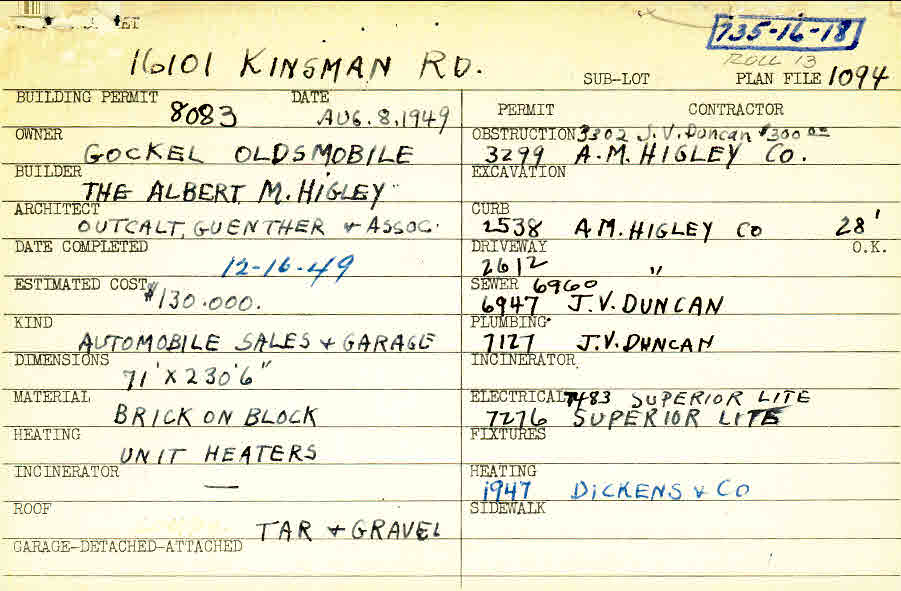 16101 Chagrin Boulevard Shaker Heights, OH 44120 PARCEL ID: 735-16-018 Building Permit Date: 08-08-1949 Plan File Number: 1094 scanned, 1189 scanned, 5002, 5744, 9508, 9509, 9510, 10732, 10847, 10848,10849 Microfilm Roll: Roll013, Roll014, Roll#69, Roll#77, Roll#103, NewRoll#5, NewRoll#6 Neighborhood: Moreland Owner: Gockel Oldsmobile Builder: The Albert M. Higley Architect: Outcalt, Guenther and Associates Estimated Cost: 130,000 Date Completed: 12-16-1949 Kind: Commercial - Retail or Office Material: Brick on Block |