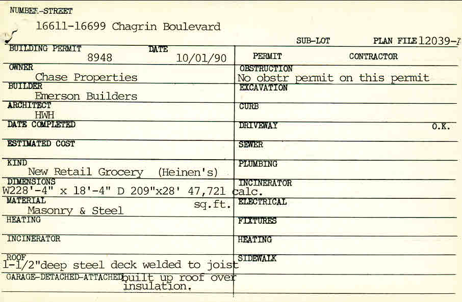 16611 - 16699 - 16711 Chagrin Boulevard new retail grocery (Heinen's) / Shaker Towne Centre Shaker Heights, OH 44120 PARCEL ID: 735-17-001 Building Permit Date: 10-01-1990 Plan File Number: 748 scanned, 1223 scanned, 19-16 scanned, 20-03 scanned, 1845 scanned, 2157, 4151, 4741, 5660 (3 entries), 5857, 6137, 6198, 6431, 9153, 10438, 10573, 12039-A, 12414, 12415, 12418, 12421-2, 12446, 12453 Microfilm Roll: Roll010, Roll014, Roll019, Roll020, Roll027, Roll#32, Roll#61, Roll#66, Roll #76, Roll#79, Roll#83, Roll#85, Roll#102, NewRoll#4, NewRoll#13 Neighborhood: Moreland Owner: Chase Properties Builder: Emerson Builders Architect: HWH Kind: Commercial - Retail or Office Material: Masonry And Steel Blueprints: blueprints also for Rini Bowling / Kinsman-Lee Bowling |