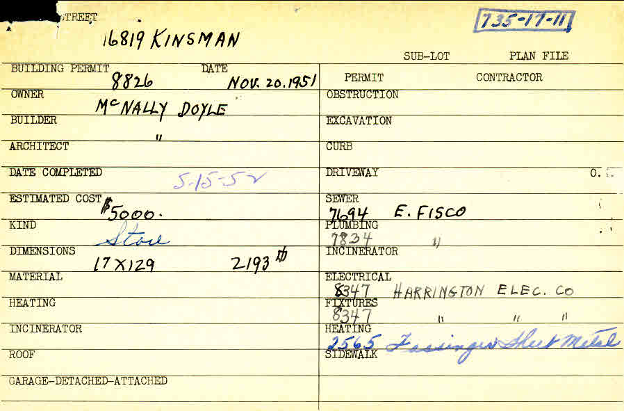 16819 Chagrin Boulevard Shaker Heights, OH 44120 PARCEL ID: 735-17-011 Building Permit Date: 11-20-1951 Plan File Number: 1864 scanned, 3373, 4138, 6413, 9136 Microfilm Roll: Roll028, Roll#49, Roll#61, Roll#85, Roll#102 Owner: McNally Doyle Builder: McNally Doyle Estimated Cost: 5000 Date Completed: 05-15-1952 Kind: Commercial - Retail or Office Card Available: Yes |  |
