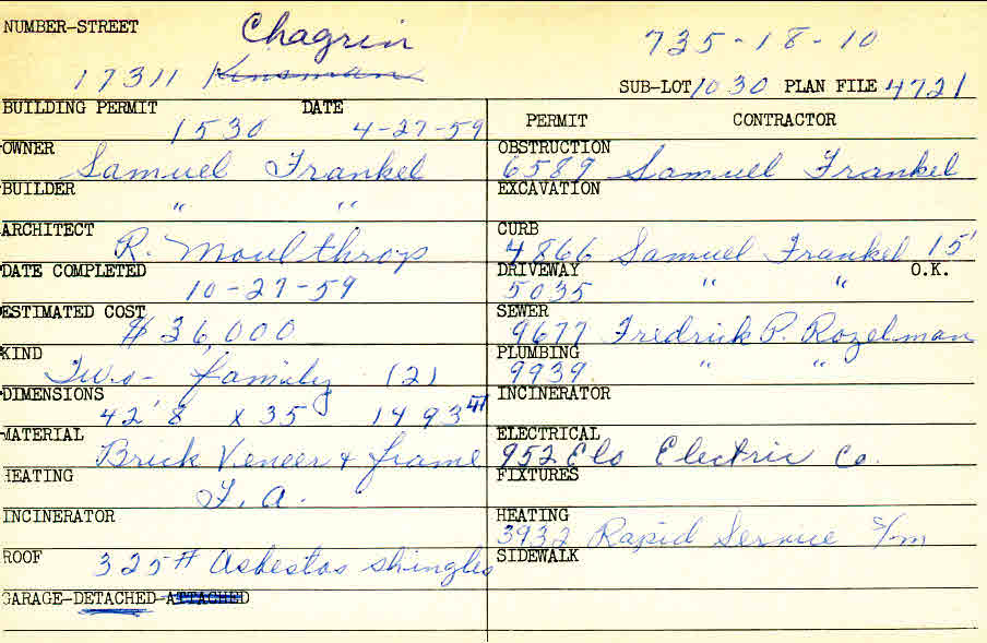 17311 Chagrin Boulevard Shaker Heights, OH 44120 PARCEL ID: 735-18-010 Building Permit Date: 04-27-1959 Plan File Number: 4721 Microfilm Roll: Roll#65 Neighborhood: Lomond Owner: Frankel, Samuel Builder: Frankel, Samuel Architect: Moulthrop, R. Estimated Cost: 36,000 Date Completed: 10-27-1959 Kind: Duplex or Two-Family Material: Brick Veneer and Frame Heating: Forced Air Roof: Asbestos Shingles Garage: detached |