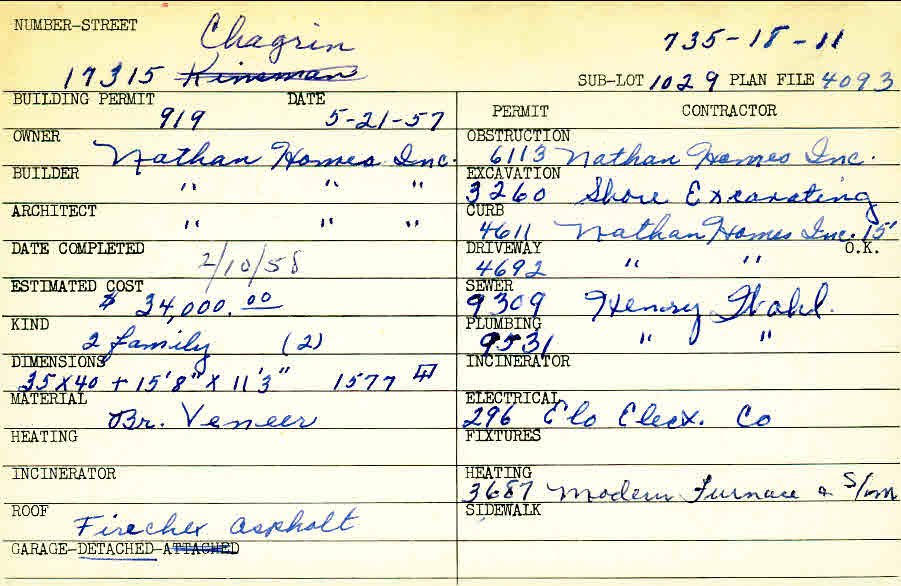 17315 Chagrin Boulevard Shaker Heights, OH 44120 PARCEL ID: 735-18-011 Building Permit Date: 05-21-1957 Plan File Number: 4093 Microfilm Roll: Roll#59 Neighborhood: Lomond Owner: Nathan Homes Inc. Builder: Nathan Homes Inc. Architect: Nathan Homes Inc. Estimated Cost: 34,000 Date Completed: 02-10-1958 Kind: Duplex or Two-Family Material: Brick Veneer Roof: Asphalt Garage: detached |