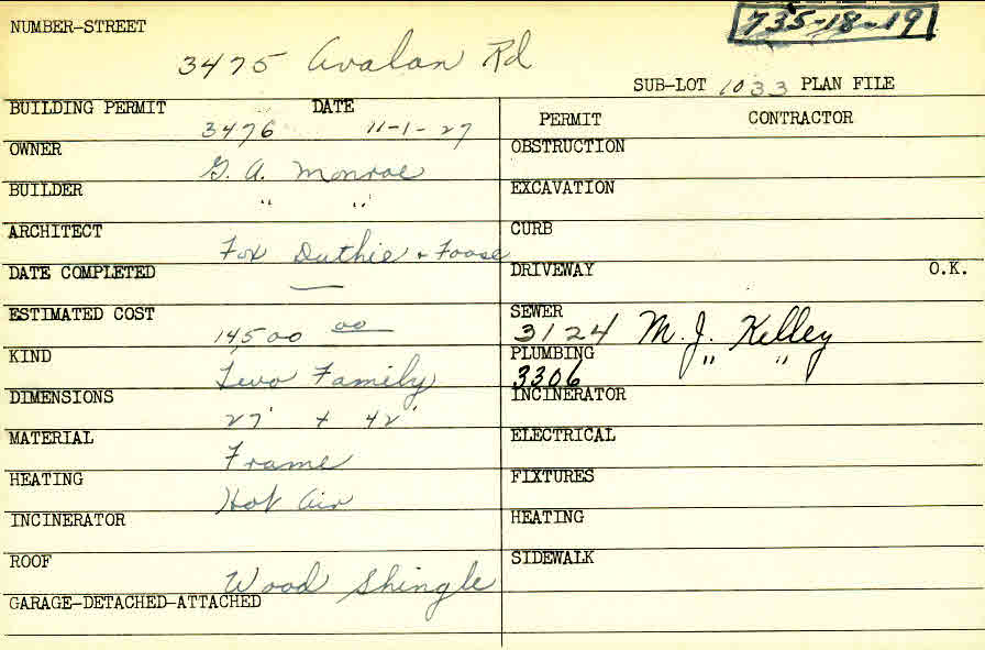 3475 Avalon Road Shaker Heights, OH 44120 PARCEL ID: 735-18-019 Building Permit Date: 11-01-1927 Plan File Number: 0 Neighborhood: Lomond Owner: Monroe, G. A. Builder: Monroe, G. A. Architect: Fox, Duthie and Foose Estimated Cost: 14500 Kind: Duplex or Two-Family Material: Frame Heating: Hot Air Roof: Wood Shingle Card Available: yes  |