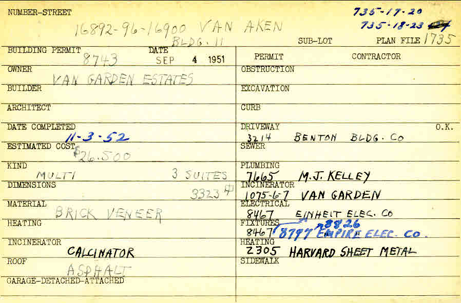 16900 Van Aken Boulevard Shaker Heights, OH 44120 PARCEL ID: 735-18-023 Building Permit Date: 09-04-1951 Plan File Number: 1735 all scanned Microfilm Roll: Roll026 Neighborhood: Moreland Owner: Van Garden Estates Estimated Cost: 26500 Date Completed: 11-03-1952 Kind: Apartment or Multi-family (3+) Material: Brick Veneer Roof: Asphalt |