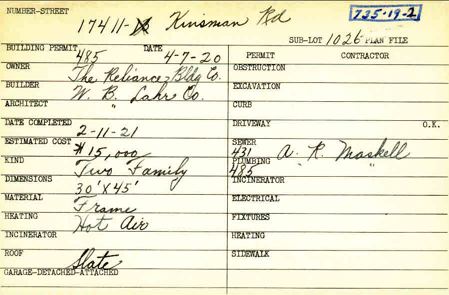 17411 Chagrin Boulevard Shaker Heights, OH 44120 PARCEL ID: 735-19-002 Building Permit Date: 04-07-1920 Plan File Number: 5550 Microfilm Roll: Roll#75 Neighborhood: Lomond Owner: The Reliance Building Company Builder: W. B. Lahr Company Architect: W. B. Lahr Company Estimated Cost: 15,000 Date Completed: 02-11-1921 Kind: Duplex or Two-Family Material: Frame Heating: Hot Air Roof: Slate |